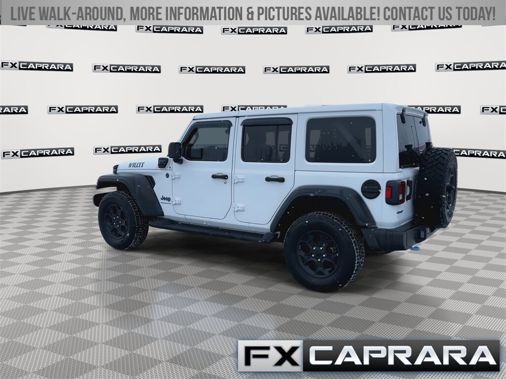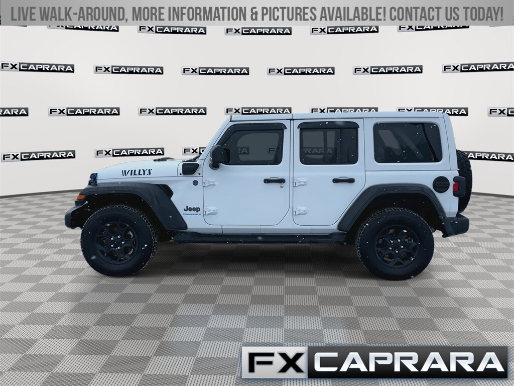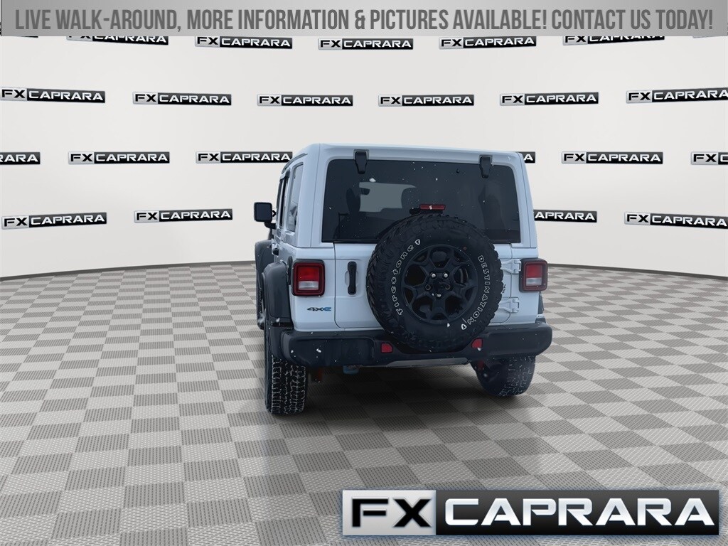2.0L I4 DOHC, 1-Year SiriusXM Guardian Trial, 3.73 Rear Axle Ratio, 4-Wheel Disc Brakes, 4G LTE Wi-Fi Hot Spot, 4xe 4-Wheel Drive Swing Gate Decal, 5-Year SiriusXM Traffic Service, 5-Year SiriusXM Travel Link Service, 8.4" Radio Group, 8.4" Touchscreen Display, 9 Speakers, 97 MPH Vehicle Max Speed Calibration, ABS brakes, Air Conditioning, Alloy wheels, AM/FM radio: SiriusXM, Anti-Spin Differential Rear Axle, Apple CarPlay, Apple CarPlay/Android Auto, Auto-Dimming Rear-View Mirror, Automatic temperature control, Black Grille, Body Color 3-Piece Hard Top, Brake assist, Cloth Low-Back Bucket Seats, Cold Weather Group, Compass, Convenience Group, Delay-off headlights, Driver door bin, Driver vanity mirror, Dual front impact airbags, Dual front side impact airbags, Electronic Stability Control, Emergency communication system: SiriusXM Guardian, Emergency/Assistance Call, For Details, Visit DriveUconnect.com, Front anti-roll bar, Front Bucket Seats, Front Center Armrest w/Storage, Front dual zone A/C, Front fog lights, Front LED Fog Lamps, Front License Plate Bracket, Front reading lights, Fully automatic headlights, Google Android Auto, GPS Antenna Input, GPS Navigation, HD Radio, Heated door mirrors, Illuminated entry, Integrated Center Stack Radio, Integrated roll-over protection, Integrated Voice Command w/Bluetooth, LED Headlamp & Fog Lamp Group, LED Premium Reflector Headlamps, Low tire pressure warning, Molded-In-Color Fender Flares (2-Piece), MOPAR All-Weather Floor Mats, Normal Duty Suspension, Occupant sensing airbag, Off-Road Info Pages, Outside temperature display, Panic alarm, ParkView Rear Back-Up Camera, Passenger door bin, Passenger vanity mirror, Power door mirrors, Power steering, Power windows, Quick Order Package 29W Willys, Radio data system, Radio: Uconnect 4 w/7" Display, Radio: Uconnect 4C Nav w/8.4" Display, Rear anti-roll bar, Rear reading lights, Remote keyless entry, Remote Start System, Security system, SiriusXM Traffic Plus, SiriusXM Travel Link, Speed control, Split folding rear seat, Steering wheel mounted audio controls, Tachometer, Telescoping steering wheel, Tilt steering wheel, Traction control, Trip computer, Universal Garage Door Opener, USB Host Flip, Variably intermittent wipers, Voltmeter, Wheels: 17" x 7.5" Black Aluminum, Willys, Willys 4xe Hood Decal, 2.0L I4 DOHC.